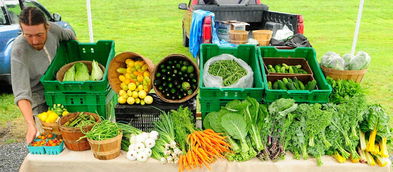 John Strieff sets up the 3 Level Farm booth for the Hallowell Farmers’ Market on Tuesday, near the corner of Water and Winthrop Streets in Hallowell.