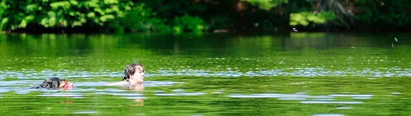 Selena Chase swims with her dog, Sophie, on Thursday in the Hallowell reservoir. It has been a popular place for people and pets to keep cool with the recent run of hot weather.