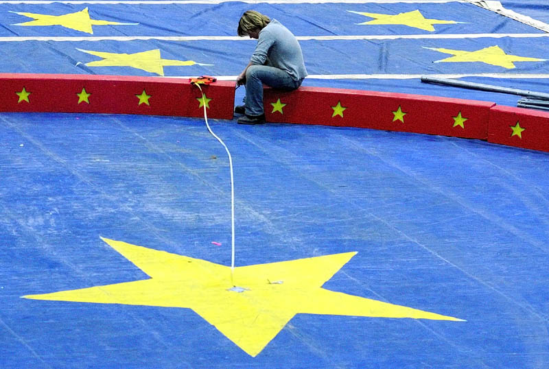 Tommy Liebel plugs together sections of lighted circus ring on Thursday at the Augusta Civic Center. There will be two rings set up for the annual Kora Temple Shrine Circus this weekend. Shows are at 2 and 7 p.m. on Friday and 9:30 a.m., 2 and 7 p.m. on Saturday.