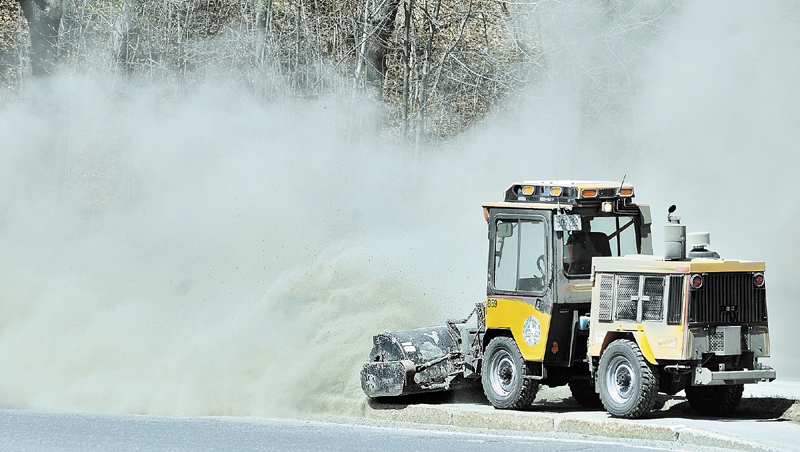 A city sidewalk sweeper cleans sand off a sidewalk on Western Avenue near Macomber Street on Tuesday in Augusta.