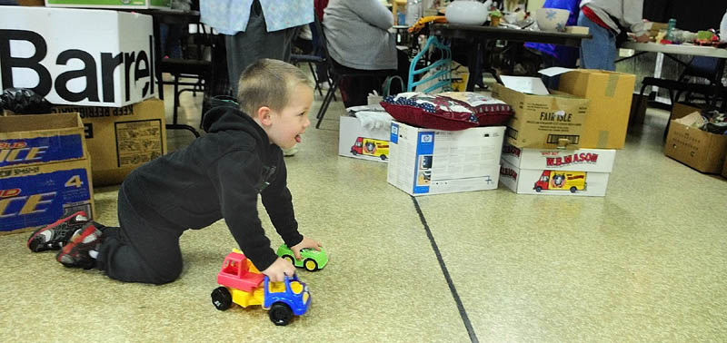 Riley Lenhart, 3 of Gardiner, takes a test drive with some toy trucks that his mother, Tona Libby, bought for him on Saturday at an charity indoor yard sale in the Knights of Columbus Council 1299 Hall in Gardiner. It was a fundraiser for Jacob Lamoreau to get hearing aids, and the Knights group was donating funds from concession and table rentals.