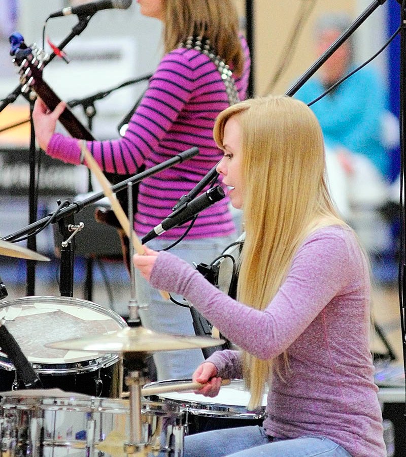 Kristen Veayo, top, and her sister, Katherine Veayo, perform a song during a school assembly on Wednesday at Windsor Elementary School. The Hall-Dale High School students, who perform as The Veayo Twins, spoke about dealing with bullying between performing covers of hit songs along with several of their own compositions.