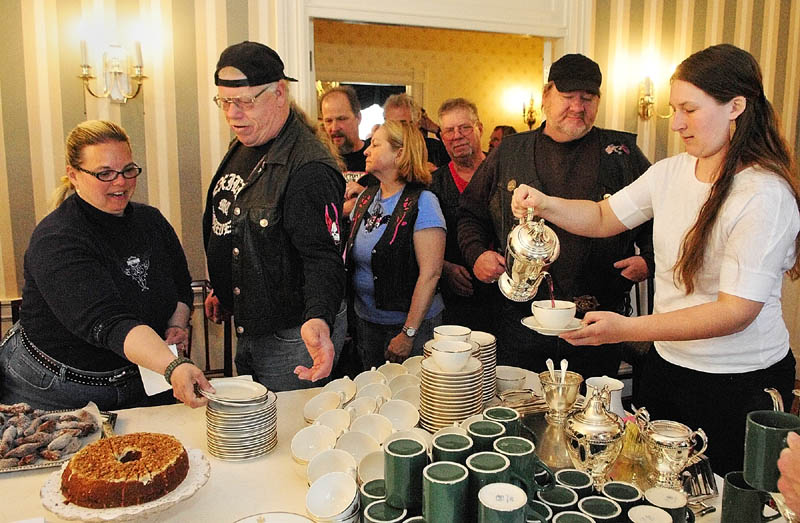 Staffer Kelsey Moody, right, pours tea for motorcyclists on Wednesday at Blaine House in Augusta. The annual United Bikers of Maine Blaine House Tea was kicked off when First Lady Ann LePage arrived as passenger on a motorcycle. There were remarks by her husband Gov. Paul LePage, other state officials and Sonny Bridges, founding father of United Bikers of Maine. There was a proclamation of May as Maine’s Motorcycle Safety & Awareness Month.
