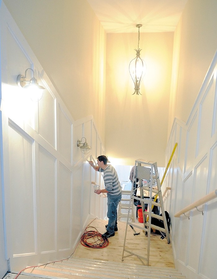 Kris Devine paints the newly installed wooden trim in the public stairway between Water Street and the Arcade parking lot on Dec. 14 in downtown Gardiner. Work is also under way at the top of the stairway, where the former Mad Dog Pub is being renovated and will reopen as Alex Parker’s Steak House.