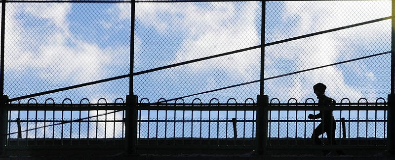 A runner out for a cold New Year’s Day jaunt heads east over the Memorial Bridge on Tuesday in downtown Augusta. The forecast for the rest of the week will be cold, with high temperatures forecast just up to the teens and 20s.
