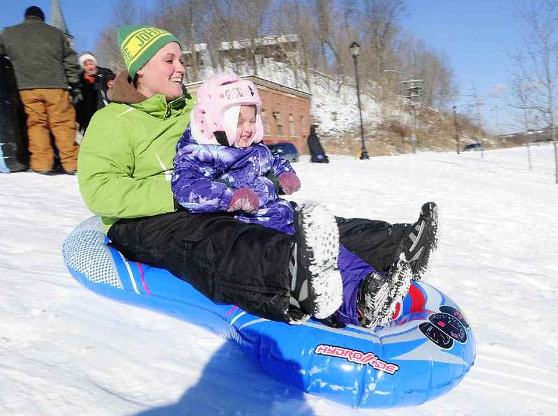 Kelsey Morin, left, and her daughter, Hadleigh Morin, 4, both of South China, slide down the Mill Park sledding hill on Tuesday in Augusta. There were several groups of sledders there on the New Year’s Day holiday. The sledding hill is near corner of Northern Avenue and Canal Street, between Sand Hill and downtown Augusta.