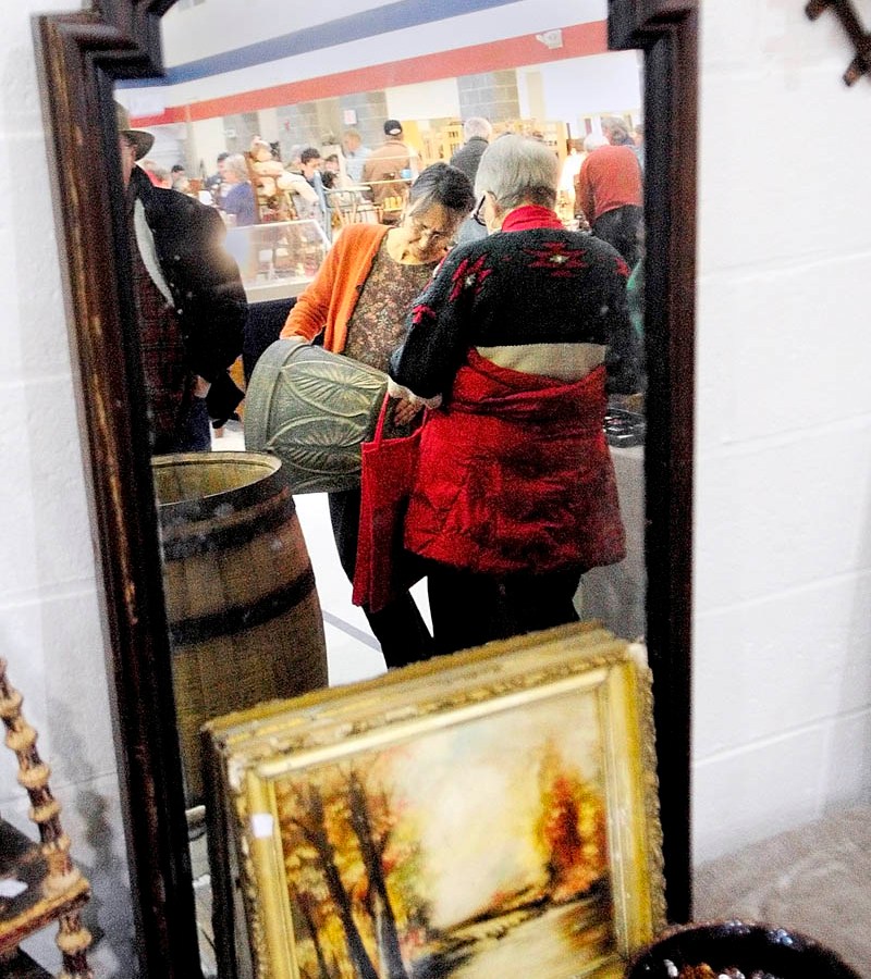 Meg Mourey, left, an antiques dealer from Lancaster, N.H., shows a piece of pottery to Miriam Buckley, of Damarine Antiques, on Tuesday at the 22nd annual New Year’s Day Antique Sale at the Augusta armory. There were 45 antiques dealers at the show.