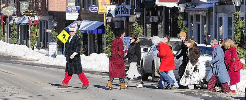 About 20 people dressed in pajamas and bathrobes or coats cross Water Street in downtown Hallowell on their way from an apartment, where they gathered on their way to a New Year’s Day brunch at Slates Restaurant, on Tuesday. One of the organizers said that pajamas for brunch has been a holiday tradition for them for at least 10 years.