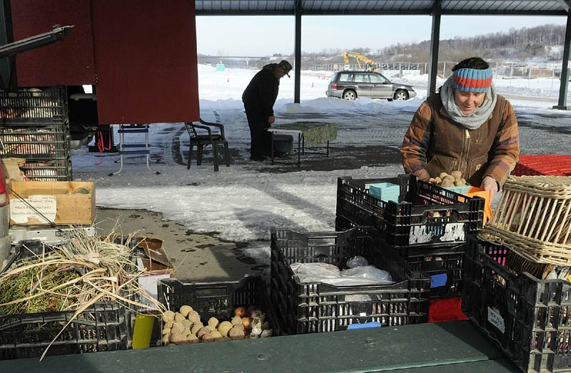 Charlie Erskine, of Erskine Farms, left, and Dalziel Lewis, of Dig Deep Farm, set up under the gazebo for the weekly farmers’ market on Tuesday in Mill Park in Augusta. The winter market runs every Tuesday from 12:30 to 2 p.m. through May, when the hours will change. Mill Park is on Northern Avenue, between downtown and Sand Hill.
