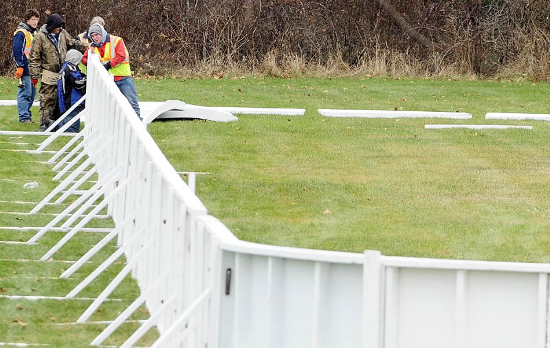 City workers set up the walls of an ice skating rink on Wednesday morning in the Calumet Playground in Augusta. The skating rink is located on Northern Avenue near the corner of Monroe Street.
