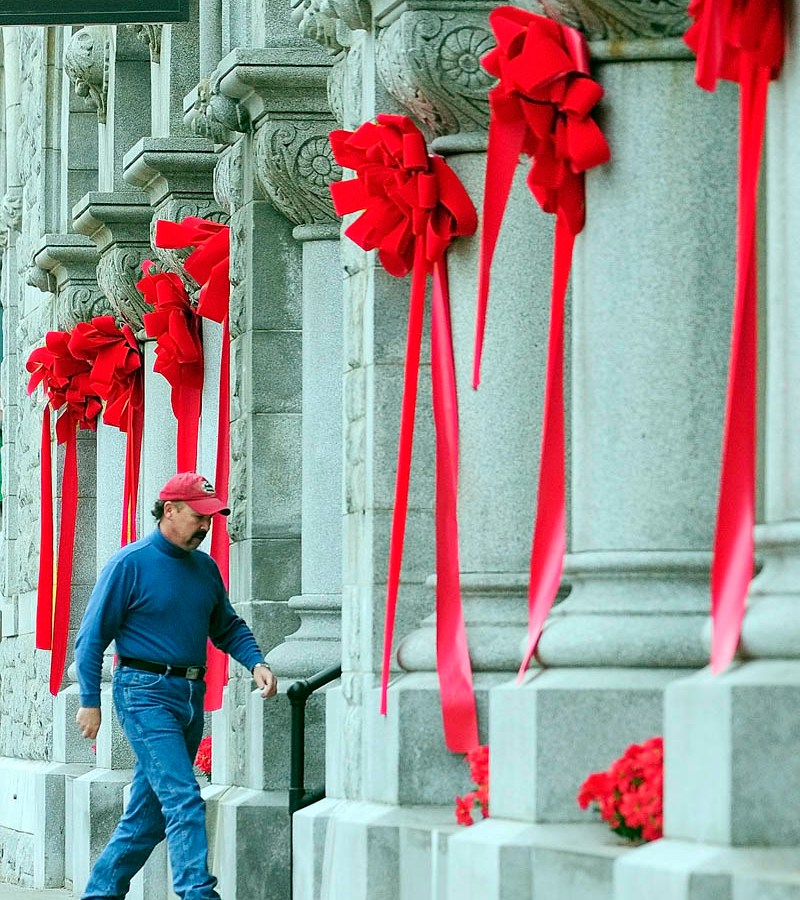 A person walks in the The Olde Federal Building on Wednesday in downtown Augusta. The flowers and red ribbons on the large ornate building at the corner of Water and Winthrop streets were from last weekend’s tree lighting events when it was Santa’s castle.