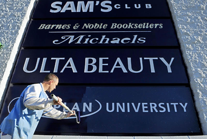 Tim Wing, of Northeast Painting and Coating, puts another coat of blue onto a Marketplace at Augusta sign on Monday afternoon in Augusta. The letters are inset, so he was able to just go over them with a roller. He said that the signs would be topped off with a new sign for the Walmart Supercenter.