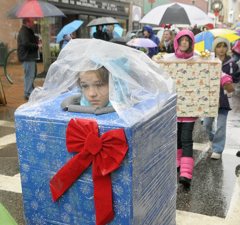 Thekla Jubinville wears a rain poncho over her wrapped present costume, as she marches down Water Street in the “Who’s Your Favorite Who” parade on Saturday, in downtown Gardiner.