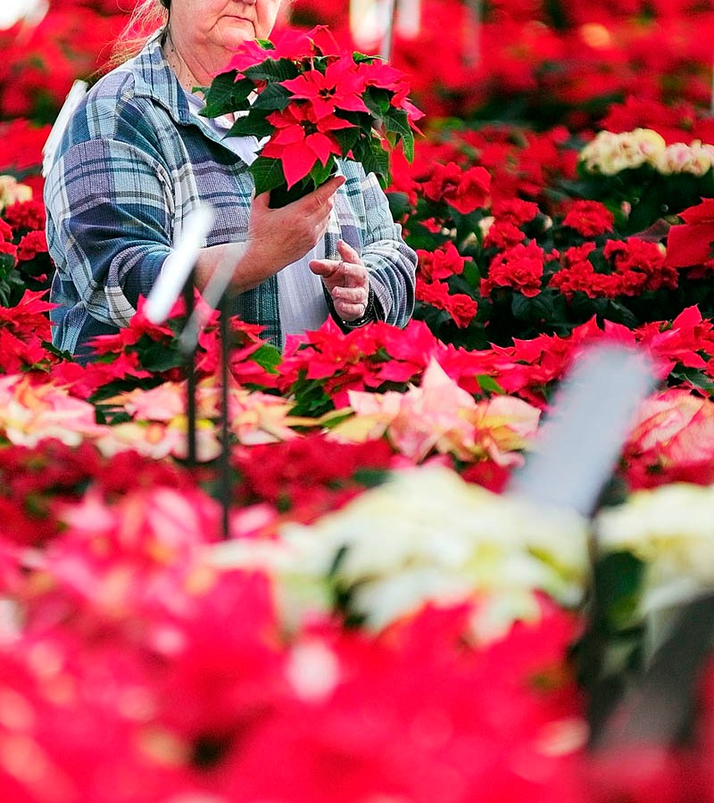 Carol Frey, of Salem Township, tries to decide on what type of poinsettia to buy on Monday afternoon at Longfellow’s Greenhouses in Manchester. They have different 60 varieties of the plant and raised about 30,000 of them according, to employee Dave LeBlanc.