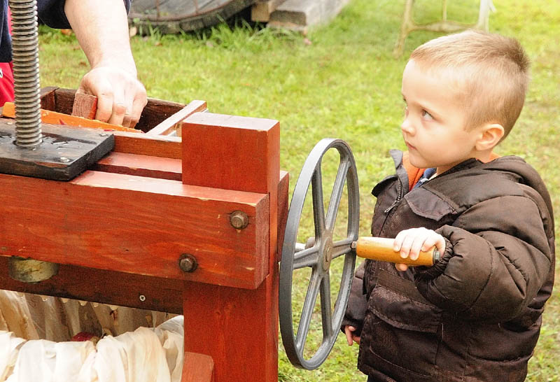 Rannon Rines, 3 of Greene, turns the handle on a cider press during Applefest events on Saturday morning at The Monmouth Museum. The events included fresh apples and apple pie for sale and a 5K road race earlier in the morning.
