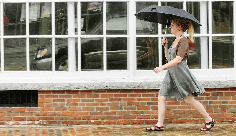 A woman walks in the rain down Water Street in downtown Gardiner on a rainy Tuesday morning.