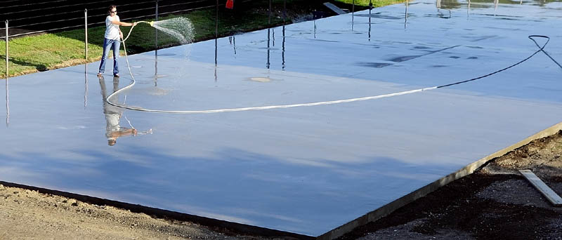 Meredith Wurpel is reflected in the water-covered concrete as she sprays down the recently poured pad at Alumni Field on Wednesday evening in Augusta.