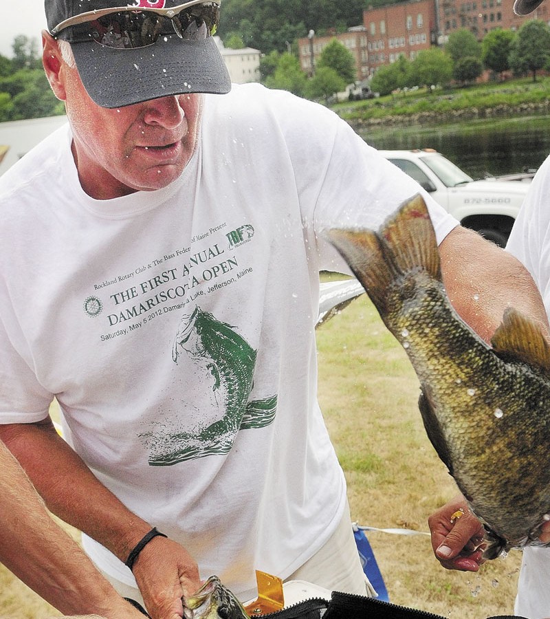 Dave Austin, of Augusta, loads fish into a bag to be weighed at the end of the Augusta Fest bass fishing tournament on Saturday at the East Side Boat Landing.