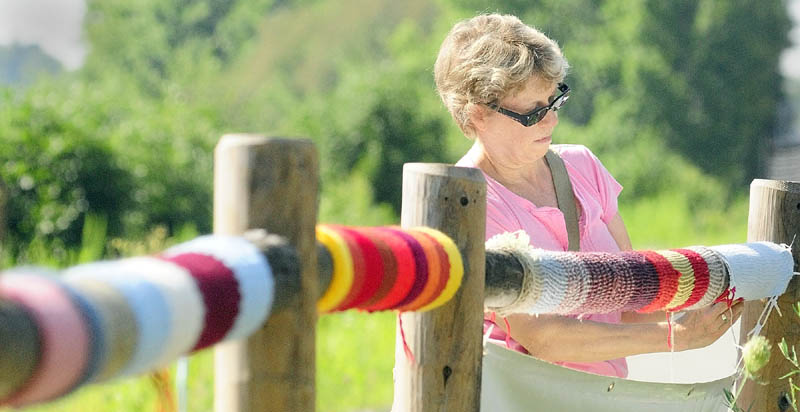 Melissa Yormac sews another flat knitted piece around the fence as part of a yarn bombing event at mile five of the Kennebec River Rail Trail on Saturday morning in Farmingdale. They were wrapping the fence and a light pole in knitted fabric. It will be reused next year or washed and assembled into blankets […]
