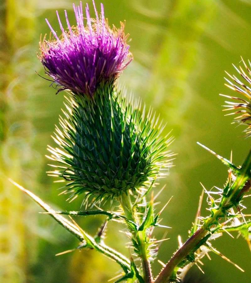 A thistle flower sparkles in the sunshine on a thorny branch recently in Belgrade. The purple flower will eventually yield white, downy seeds that will disperse in the wind.
