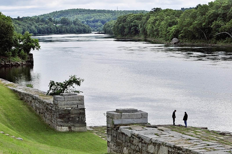Fishermen stand on the old granite docks on the Kennebec River below the Kennebec Arsenal recently in Augusta.