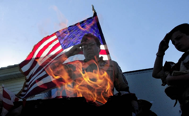 A flag held by the color guard flutters behind him as Scout Master Randy Hooper and an unidentified Boy Scout salute during Thursday evening a ceremony where unserviceable flags were respectfully disposed of by burning at the Alfred W. Maxwell Post 40 of the American Legion in WInthrop. The annual event was held on Flag […]