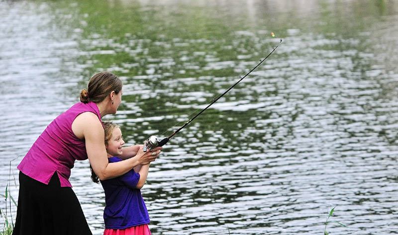 Jayla Donohoe, 5, right, gets some help casting a lure into Cobbossee Stream from her mother Jennifer Boynton on a recent evening in Gardiner.