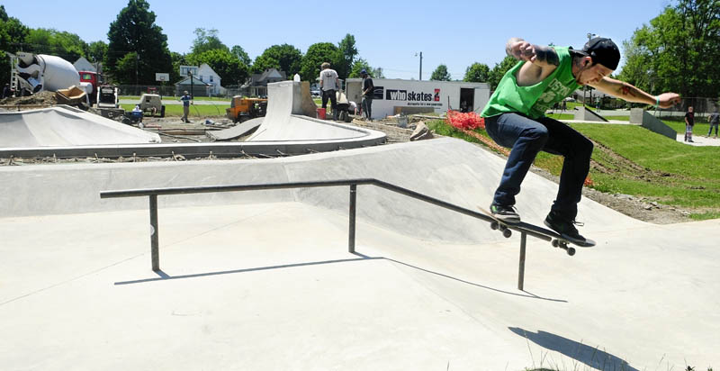 Nolan Brann, of Augusta, skateboards at the Augusta Skate Park as the Who Skates crew continues building the second phase bowl section in the background. He and other skateboarders said Thursday that they were looking forward to being able to use the new section, which should be ready soon.