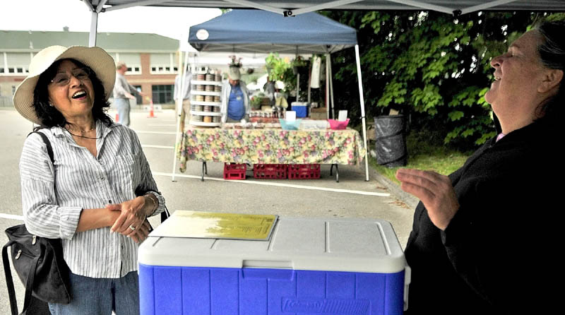 Customer Mercedes Longfellow, left, laughs with vendor Karen Trenholm as they visit in her Wholesome Holmstead stand on Saturday morning at the Winthrop Farmer’s Market. The market is in the town office parking lot at the corner of Highland Avenue and Maine Street on Saturday mornings from 9 a.m. to 1 p.m.