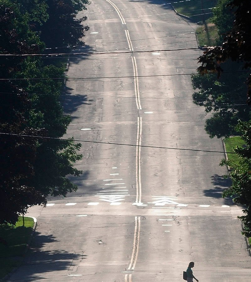 As the sun sets over the back of the hill behind them, a walker crosses Winthrop Street recently in Augusta.