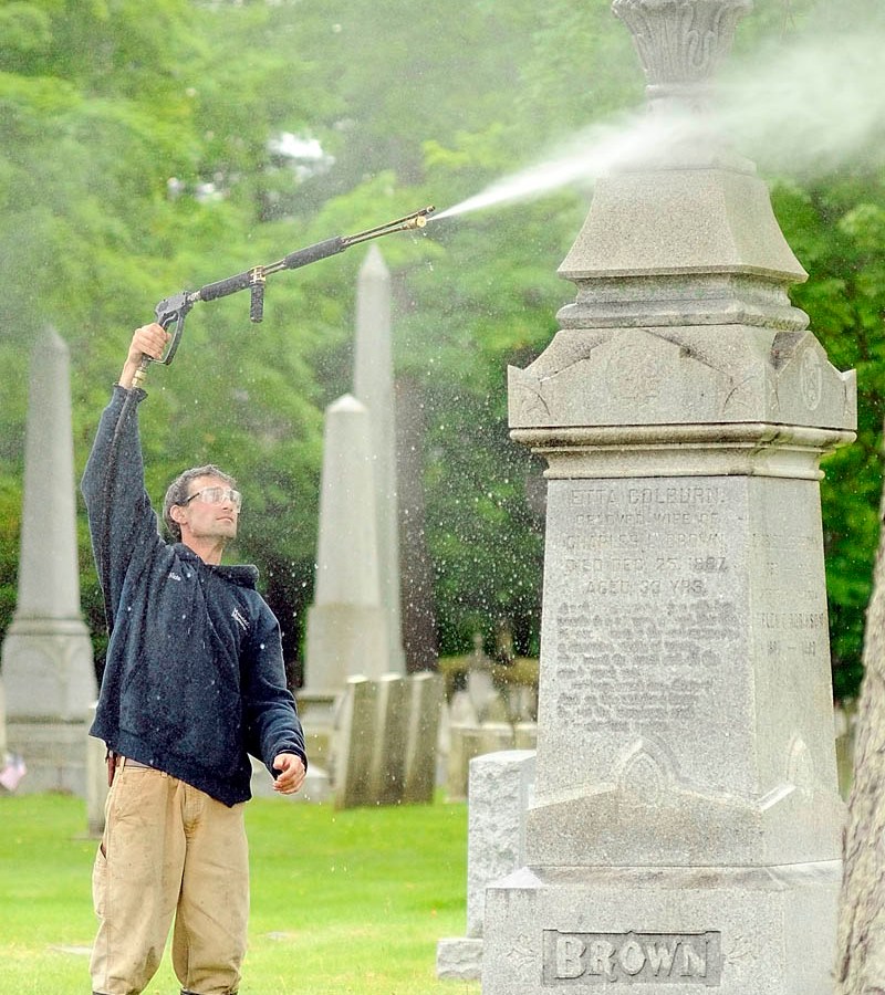 Nate Taczli power washes one of the monuments in the Hallowell Cemetery on Friday morning. He and another Masciadri Monuments employee were cleaning stones in the cemetery located on Water Street.