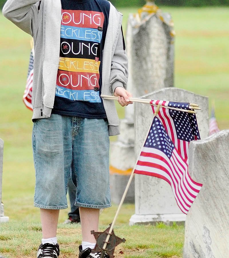 Colby Russell-Leo salutes after placing a flag in a holder in front of the gravestone of a veteran Friday at Plains Cemetery in Litchfield.