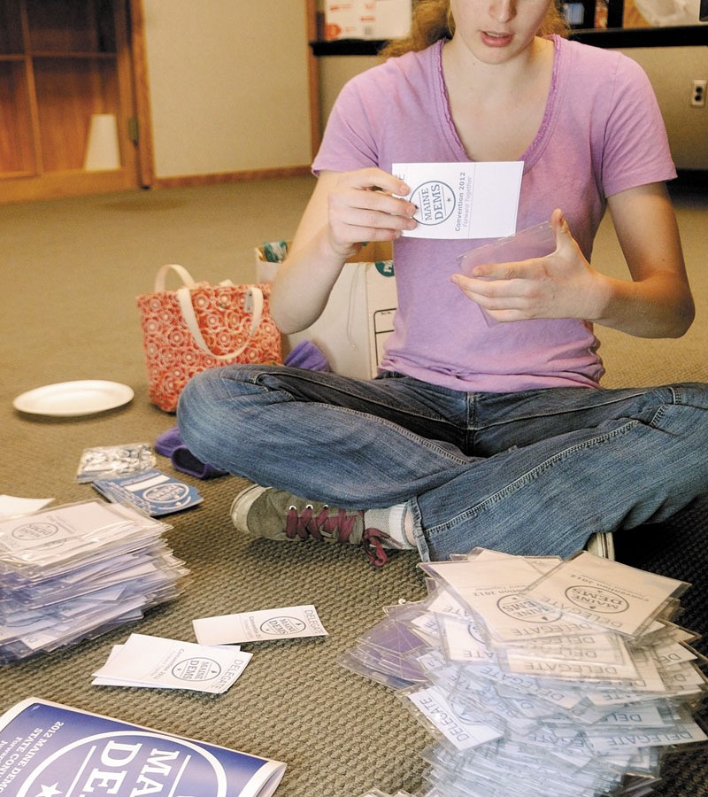 Hanna Willwerth works on delegate credentials, on Thursday afternoon, the day before the Democratic Party state convention opens, at the Augusta Civic Center. She is a Greeley High School senior and doing a senior project internship with the state party.