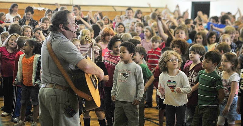 Paul Bright leads Winthrop Grade School students in a song at the start of the musical tribute to late third grade teacher Bill Giasson, put on by several of his friends who were members of the Downeast Country Music Association. Giasson’s sister and his children spoke to the students and donated one of his guitars to the school before the show started. Giasson, who died in February at age 61, had facilitated the Augusta Kinship Support Group, a group for people raising a relative’s child, for 10 years. That group established a memorial music camp scholarship in his honor for four students.