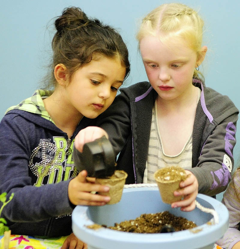 Delaney Ellis and Skylan Bella, both 7 of Turner, fill their little containers with potting soil to plant corn seeds as part of Earth Day events on Thursday morning at the Children’s Discovery Museum in Augusta. The museum has been busy this week since most school children are on vacation this week, according to executive director Carrie Arsenault.