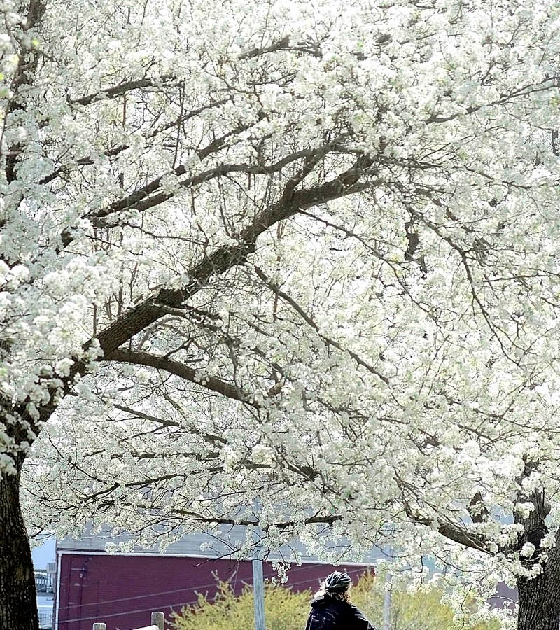 A cyclist passes under flowering ornamental trees on the Kennebec River Rail Trail while heading into downtown Hallowell on a warm, sunny Sunday afternoon.
