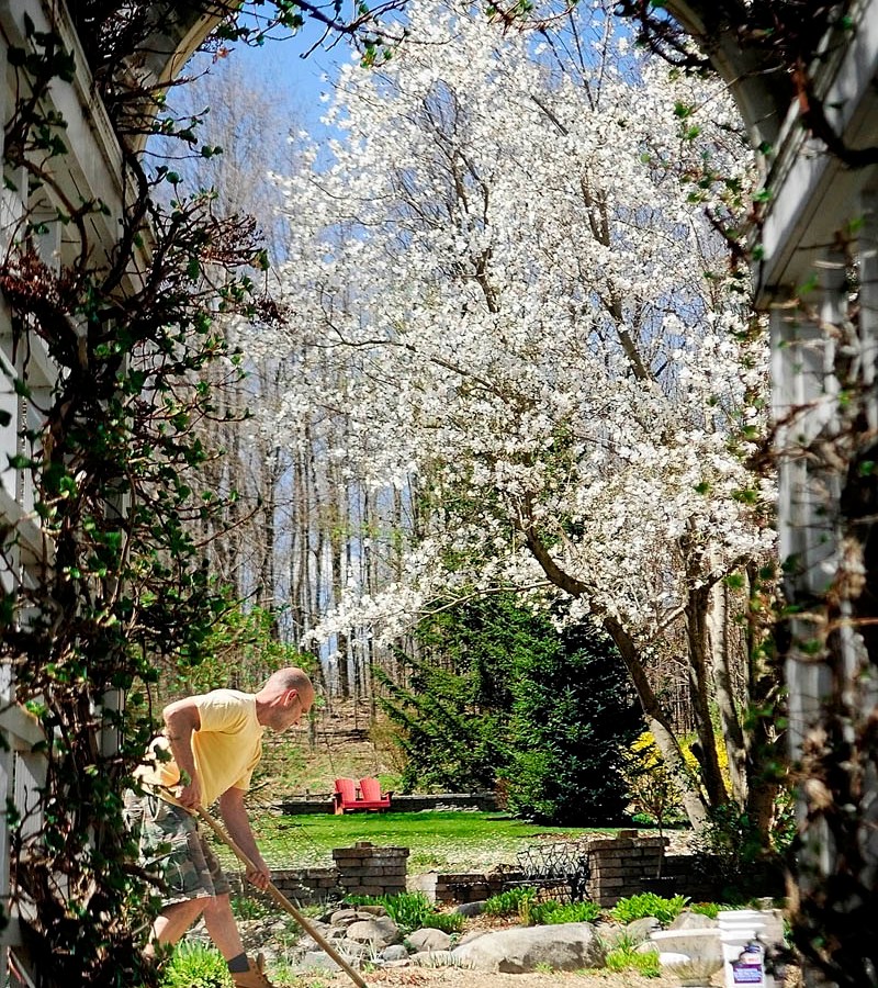 Thomas Warner, owner/innkeeper at Benjamin Wales House, is framed by an arbor as he works in the gardens of his bed and breakfast on Thursday afternoon in Hallowell.