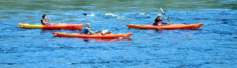 A trio of kayakers paddle past a small rapids in the Kennebec River between Mill Park and the former American Tissue paper mill in Augusta on a sunny Saturday afternoon.