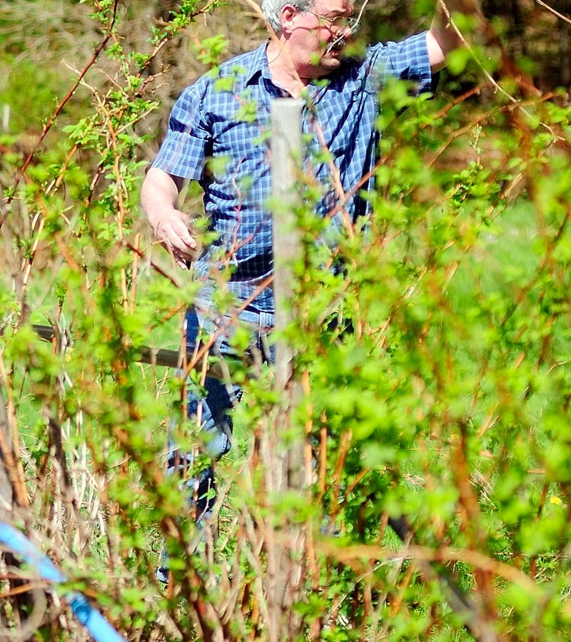 Ken Shephard prunes a raspberry patch on Thursday afternoon in Farmingdale. He said that was just cutting out the old and dead canes to make room for the new green ones to grow.