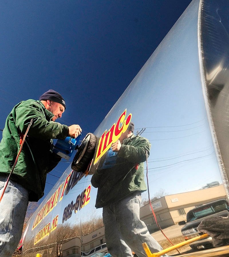 Living up to his company’s name, Paul Kidder, of Mirror Image, polishes an aluminum oil tank truck on Tuesday afternoon at Chapman Fuel in Gardiner. Kidder said that he started his business in Maine. He is now is based out Connecticut and works on trucks in 14 states.