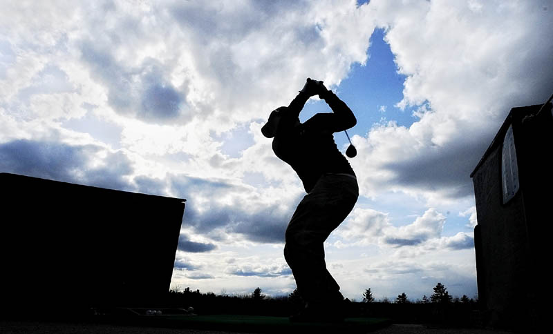 Chad Moriarty, of East Winthrop, winds up to drive a golf ball at T’s Golf on Thursday evening in Manchester. There is a chance of showers on Sunday, so it looks as though Saturday and Monday’s forecasts might be the best for hitting a bucket of balls over the long holiday weekend