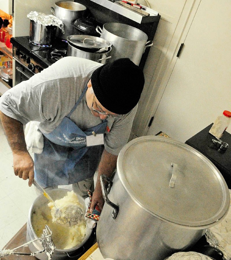 Ray Chavarie stirs mashed potatoes on Thursday morning at the Green Street United Methodist Church in Augusta. He and many other volunteers put on the church’s 32nd annual community Thanksgiving dinner. They served turkey, potatoes, peas, squash, stuffing, cheese and crackers and pies.