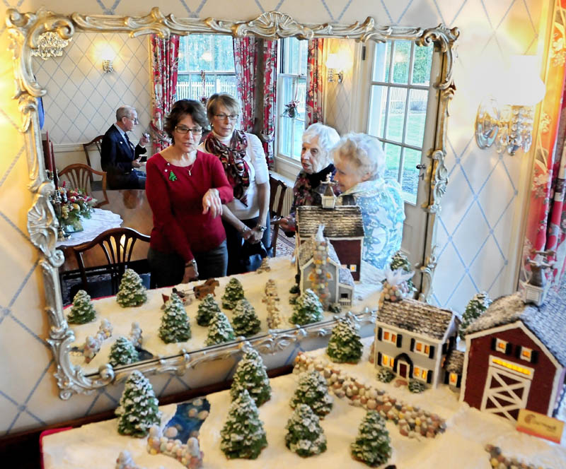 Visitors look at the gingerbread house displayed in the Blaine House’s family dining room on Thursday afternoon in Augusta. Earlier in the week, about 42 members of the Kennebec Valley Garden Club set up decorations in the public areas. This year’s theme for the decorations was over the river and through the woods.