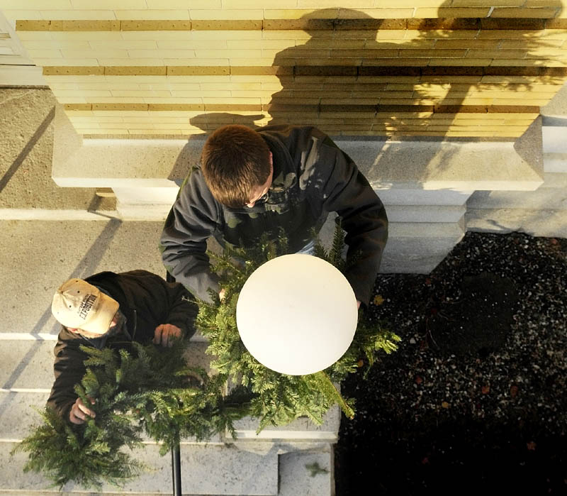 Lew Robichau, left, and Joe Grant, from Wingate Landscape, wrap garland around a light pole at Hallowell City Hall on Thursday afternoon. The city will hold Christmas in Old Hallowell events on Saturday, including a parade down Water Street at 5 p.m., followed by fireworks. A complete schedule of events is available at oldhallowellday.org.
