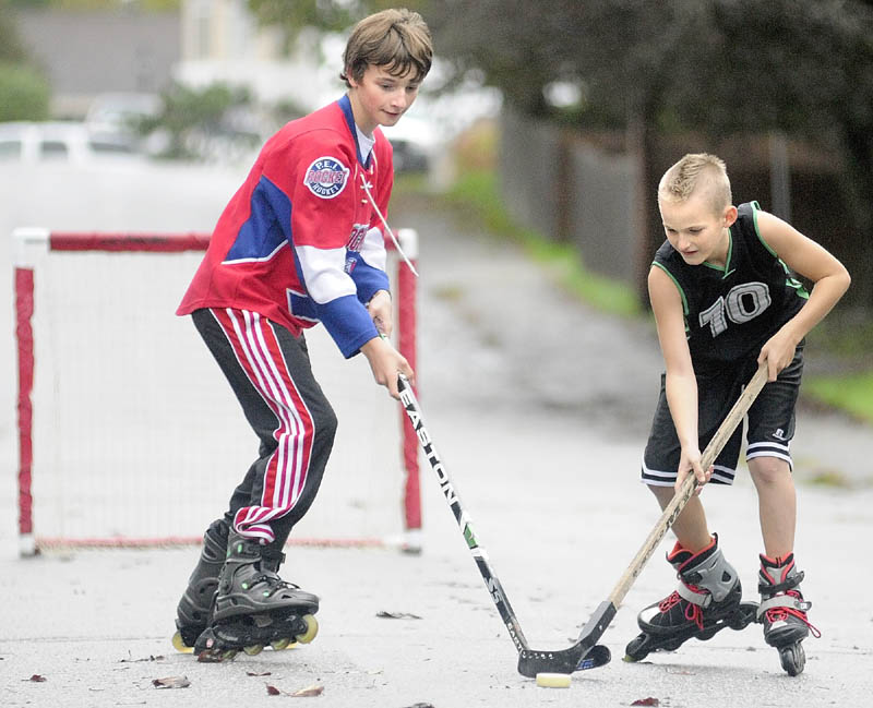 Cameron Gallant, left, and Jonathan Hanson play street hockey on inline skates on a recent wet afternoon in Augusta.