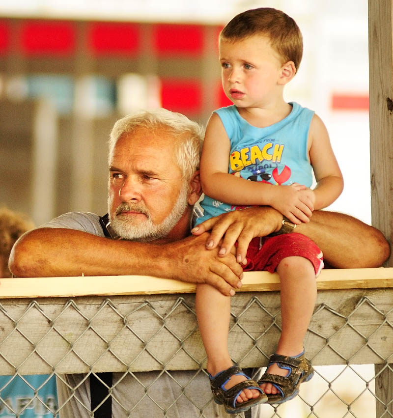 Peter Dube, Sr., of Augusta, holds onto his grandson Peter Dube III as they watch oxen pulling at the Pittston Fair on Thursday afternoon. The fair runs through Sunday and the fairgrounds are on Route 194 near Mast Road.
