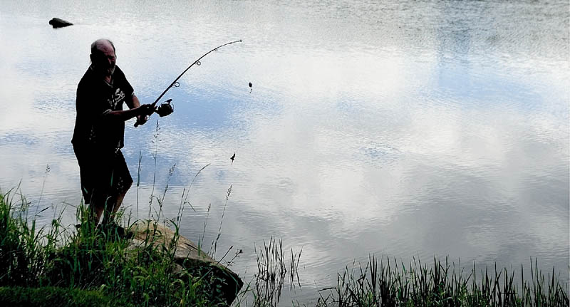 Paul Golden, of Lewiston, casts into the Kennebec River from Butternut Park in Chelsea on a warm evening last week. Golden and others were trying to catch striped bass at high tide from the Ferry Road boat launch.