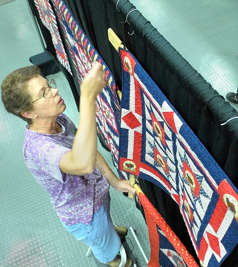 Vicki Tottle, of Limerick, one of the many volunteers hanging some of the over 700 quilts, that will be on display over the weekend, Wednesday afternoon at the Augusta Civic Center. The 34th annual Maine Quilts show runs through Sunday and also includes workshops, exhibits and vendors. For more information check www.mainequilts.org.