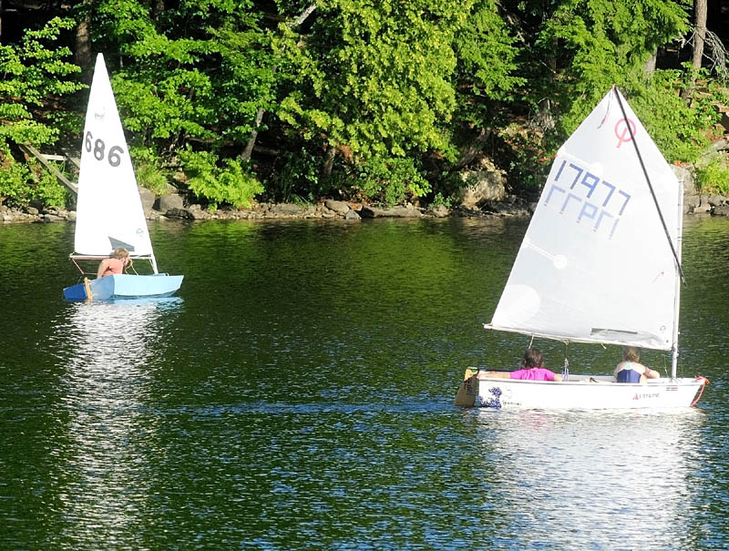A pair of small sailboats ply the waters of Minnehonk Lake on as the sun begins to set on Thursday evening in Mount Vernon.
