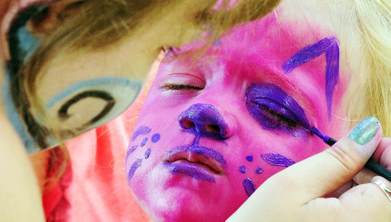 Corrie Donahue, of Monmouth, left, paint’s a pink and purple cat on the face of Gwen Lewis, 3 of Winthrop, at the Raspberry Festival last weekend at the East Winthrop Baptist Church. The festival featured pies, barbecue sauce and other food with raspberries along with pony rides.